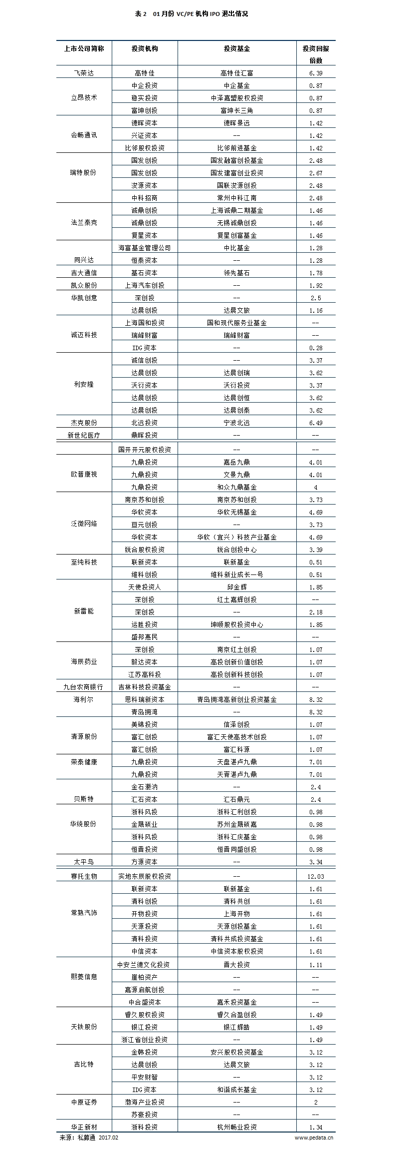 根据清科私募通数据统计:2017年01月,60家IPO企业中12家企业有VC/PE支持,占比20.00%。IPO退出共32起,涉及74家机构、70支基金和1位投资人。本月IPO退出数量同比上升966.67%,环比上升10.34%。以发行价计算,2017年01月IPO退出平均回报倍数为2.72倍。