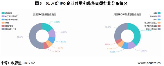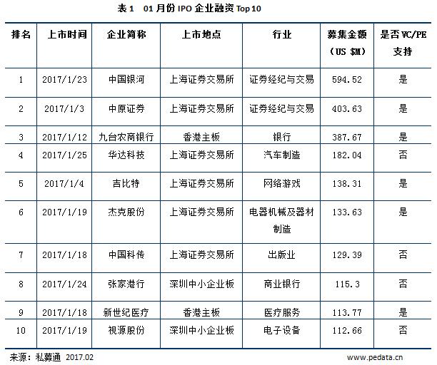 本月IPO企业融资Top 3 均由银行券商股占据。中国银河、中原证券回归A股,成为A+H两地上市券商。2017年1月23日,中国银河(证券代码:601881.SH)登陆上交所,发行价6.81元/股,募资40.86亿元人民币,位居本月IPO募资额榜首。中原证券(证券代码:601375.SH)也在1月份成功在上交所IPO,发行价为4元/股,募资28.00亿元人民币。此外,九台农商银行(证券代码:06122.HK)在1月12日登陆香港主板,募资30.10亿元港币,位居本月募资额第三。