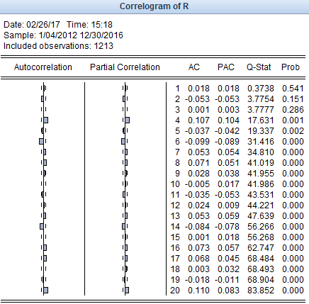 在做股市收益率波动分析时,arch效应检验前,需要做收益率自相关分析以确定均值方程,自相关图如下: