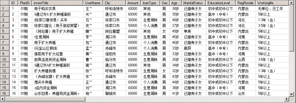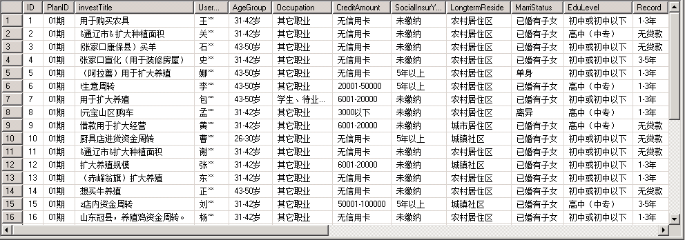 翼农计划-债权记录表:所属计划、借款标题、借款人姓名、身份证号、借款人地区、借款总额、借款描述、借款类型、借款人性别、借款人年龄、婚姻状况、文化程度、户口所在地、工作年限、职称、房产、年收入、年龄段、职业、信用卡额度、商业保险、社保年限、长期居住地、婚姻状况、教育程度、贷款记录、征信报告、项目名称、车担保增额、人担保、房担保增额、成功借入次数、流标次数、待还款期数、已还款数、逾期还清期数、逾期未还期数;