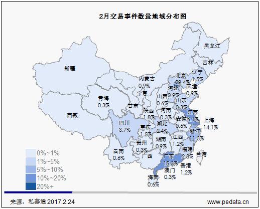 截止本周五下午,投资、上市和并购共92起事件,涉及总金额416.60亿元人民币。从交易金额来看,涉及金额较大的事件是2017年2月22日,金瑞新材料科技股份有限公司成功受让五矿资本控股有限公司,作价149.2亿人民币。从交易事件地域分布看,目前主要分布在北京市、广东省和上海市,占比分别为29.4%,15.3%和14.1%。本周新三板市场共有92家企业挂牌,新增加股本为35.00亿股,本周新三板成交总金额为53.56亿元人民币,目前共有10715家企业挂牌新三板,总股本为6084.41亿股。