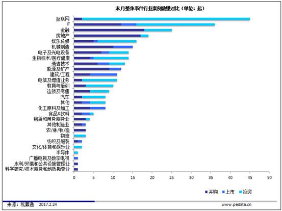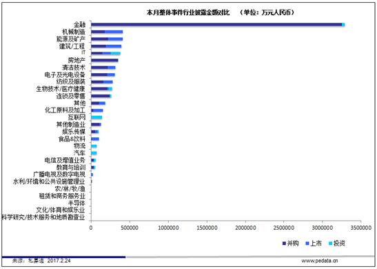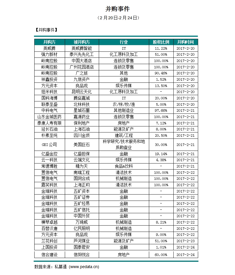 截止本周五下午,本周并购市场共发生33起并购事件,交易金额为358.45亿元人民币。从并购事件交易数量来看,本周金融行业发生8起并购事件,排名第一。本周并购金额较大的并购事件是:2017年2月22日,金瑞新材料科技股份有限公司成功受让五矿资本控股有限公司,作价149.2亿人民币。本次增资完成前,金瑞科技持有五矿资本100%股权,并通过五矿资本间接持有五矿证券有限公司99.76%股权、五矿经易期货有限公司99.00%股权、五矿国际信托有限公司67.86%股权和中国外贸金融租赁有限公司50.00%股权,以及五矿资本其他下属相关金融企业股权。通过本次增资,将大大增强上述企业的资金实力和市场竞争力,促使其快速抓住市场发展机遇,实现跨越式发展。金瑞科技也将在原有新能源电池业务稳定发展的基础上,有效拓宽盈利来源,提升可持续发展能力、抗风险能力以及后续发展潜力,并为整体经营业绩提升提供保证。