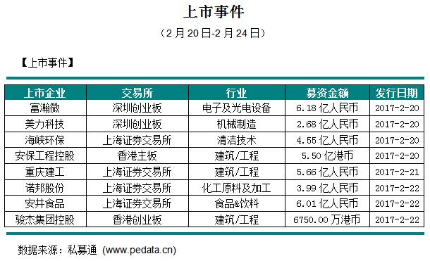 截止本周五下午,本周共有8家企业上市,总融资金额34.53亿元人民币。本周融资金额较大的上市事件为:2017年2月15日,上海富瀚微电子股份有限公司在深圳创业板上市,发行股票11111500股,每股发行价55.64元人民币,共募集资金金额6.18亿人民币。富瀚微电子是我国最早从事安防视频监控多媒体处理芯片设计业务的企业之一,主要产品为安防视频监控多媒体处理芯片及数字接口模块;主要客户为安防视频监控设备整机厂商、电子设备整机厂商和芯片代理商等企业级客户。其芯片及解决方案目前已扩展到无人机航拍、行车记录及家庭视频监控等市场。