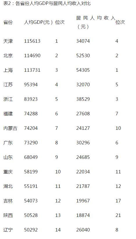 另一方面,人均GDP并不等同于居民人均收入。由于产业结构的差异,一些人均GDP很高的地方,其人均收入并没有那么高。