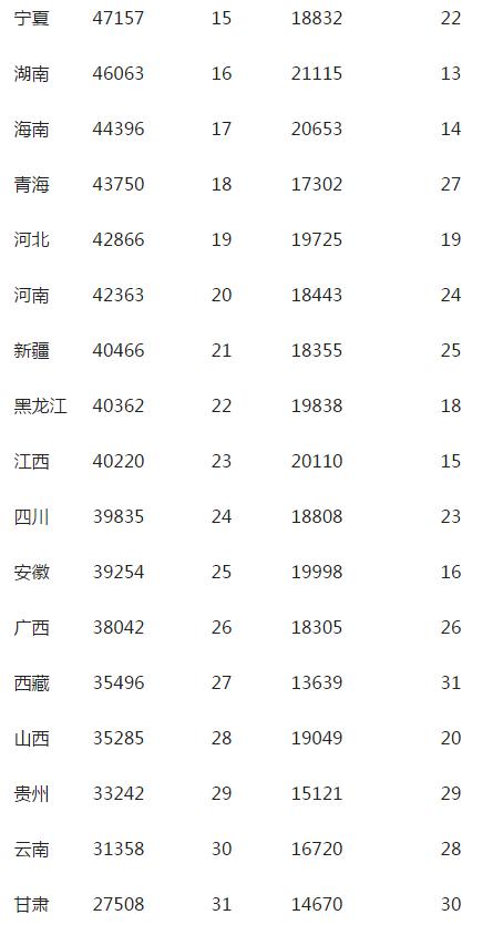 在榜尾,有8个省份的人均GDP低于4万元大关,除了安徽、山西之外,其余全部位于西部地区。