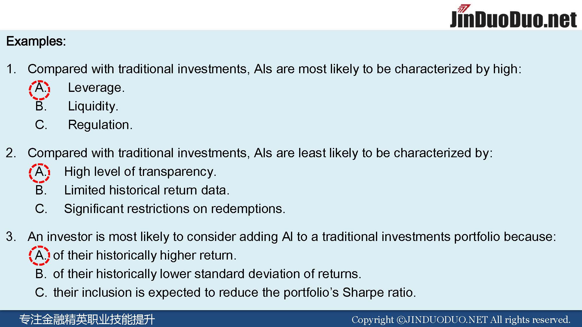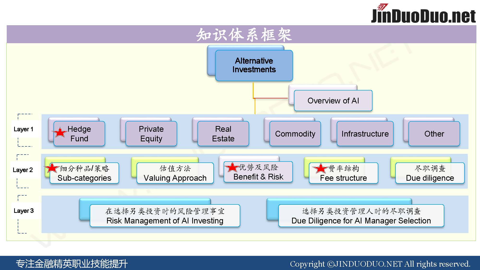 CFA一级的另类投资在考试中的占比是最少的(3%),但是这部分的内容却是最有意思的,因为我们会接触到例如对冲基金,房地产投资,私募股权投资,大宗商品,基础设施投资等在金融工作中耳熟能详的概念,而且我们相信这些概念是金融从业人员的重要知识基础。所以我们在讲解的过程中,不仅力求让大家学到课本上的知识,还力图融入一些课本上所没有的实务操作示例,这种理论结合实际的教学可以充分激发起大家的学习热情。另外,由于notes上的内容覆盖并不理想,所以我们的课件框架及例题均以官方教材为主,这样既可以让大家在考试的时候在这部分拿满分,也可以作为重要资料收藏。