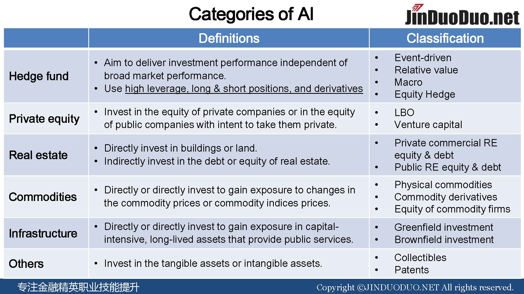 具体来讲,本章首先我们会介绍另类投资区别于传统投资的一些重要属性,并辅以其在投资组合管理中的risk-return特征,这些知识不仅是一级的重点,到了三级仍然可能会考到。然后我们会根据另类投资的分类进行具体分述: