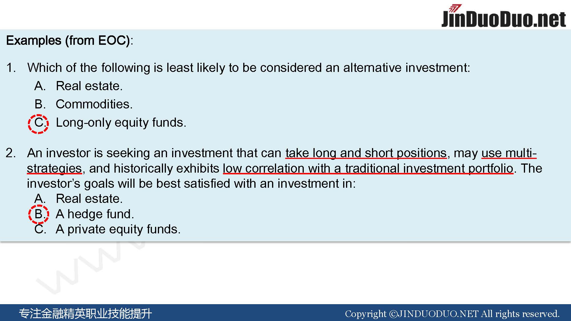 1.对冲基金(内容最多最重要,考点很多):一般来讲对冲基金都是按照其策略属性的不同进行分类(event-driven, relative value, macro, equity hedge),而每个策略属性下面又带有很多的具体策略,考试一般会给出描述,让你判断出其对应的具体策略名称。明确了策略之后,我们会具体讲解对冲基金的收费结构,因为这与投资者的自身利益切实相关,所以关于management fee与incentive fee的计算是必考内容,请大家一定熟练掌握,而且这对你在工作中设计方案也大有帮助。剩下的还有一些零碎内容,比如对冲基金高杠杆的特性以及潜在的后果;对冲基金估值的原则;投资对冲基金所做尽职调查的关键点等,这些内容掌握起来很容易。