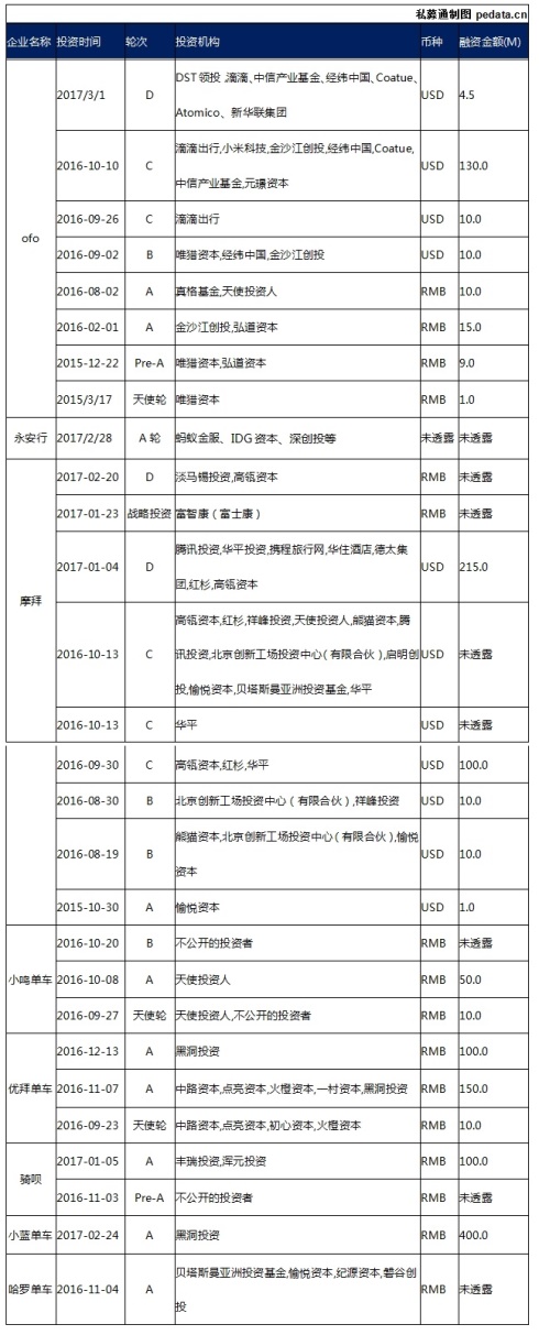 私募通(微信ID:pedata)在此整理了部分共享单车平台的融资情况: