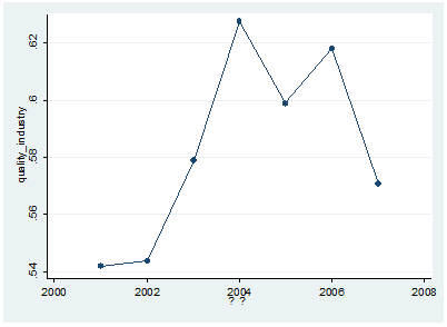 twoway (scatter quality02 year,connect(l),if ownership01 ==0 ) (scatter quality02 year,connect(l),if ownership01 ==2) (scatter quality02 year,connect(l),if ownership01 ==3) xtick(2001(1)2007) xlabel(2001(1)2007)