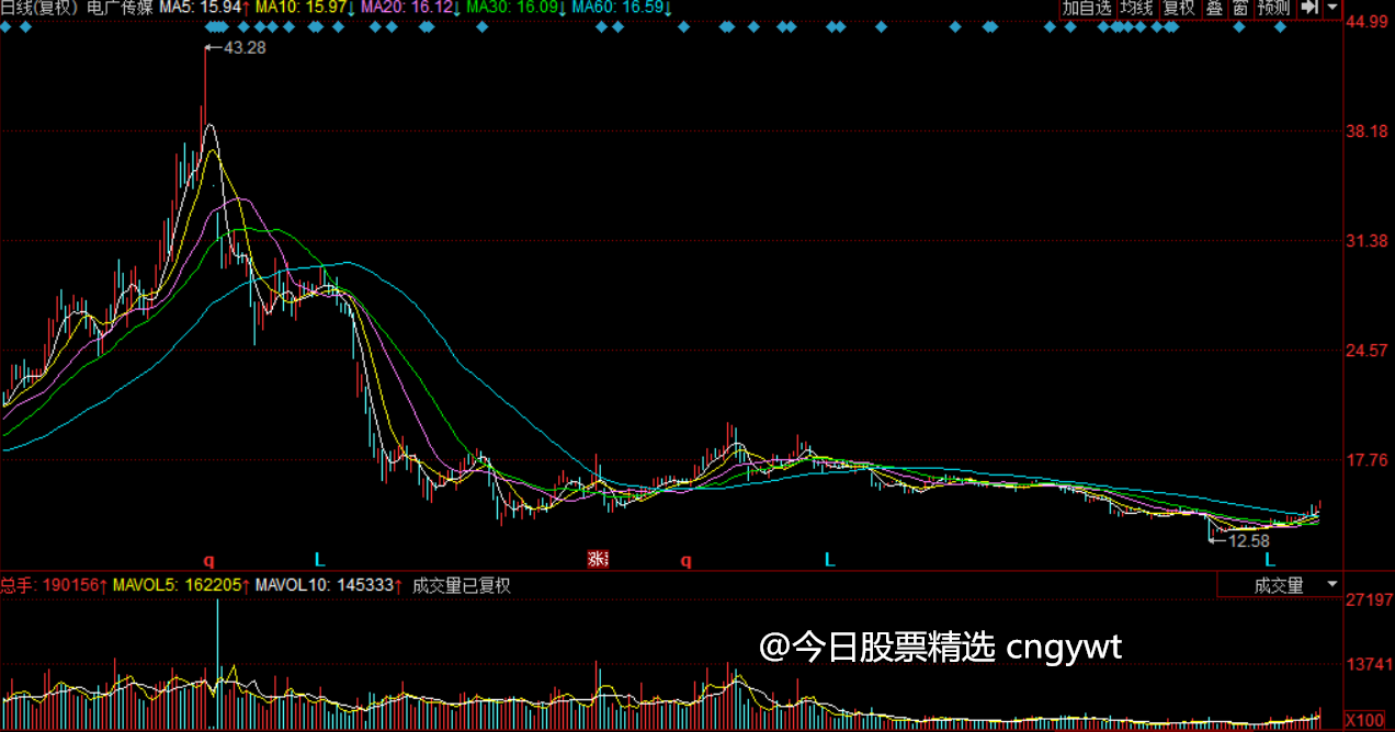 2015年是A股历史上第二强势的牛市,同时也是中国电影票房达到高潮的一年,在2015年中股价上涨至历史最高的43.28元。2016年,电广传媒如同中国电影跌入低谷,股价一直在震荡走低,最低跌至今年12.58元,目前该股处在震荡上涨趋势中,近日受360回归A股和奥斯卡的刺激,连续量价齐升,突破60日线的压制,后市上涨空间大。投资者可在14.90元附近关注,目标涨幅6%以上,设止损价为14.45元。