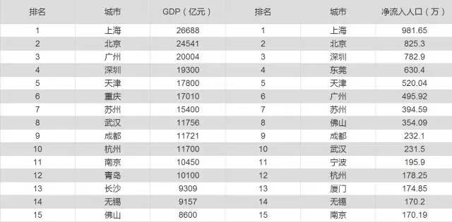 这十五座城市在不同的评价体系下各有优势和缺陷,但要选出最有潜力成为“新一线城市必须要具备过硬的实力,至少在GDP、人口流入等硬性指标上不能出现明显短板。这里题主选用GDP、净流入人口两项硬指标,对十五座城市进行筛选。用GDP来剔除经济实力较落后的城市,用人口净流入剔除对人口吸引力相对较弱的城市。2016年GDP和净流入人口排名前十五的城市如下表所示:
