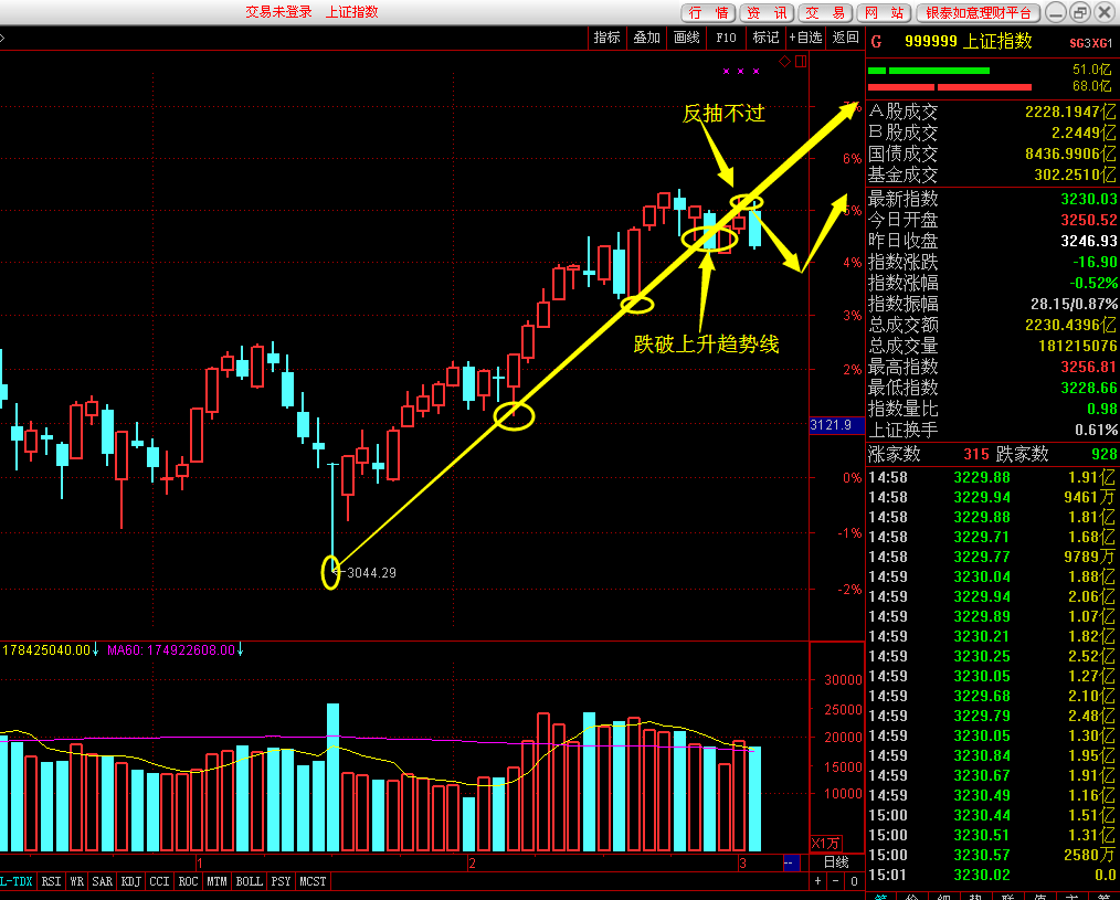今天两市高开后震荡下行,权重的护盘并没有激发人气,前期大涨的板块纷纷回落,正如之前预期的一样,指数在跌破上升趋势线后反弹没有量能的支持,趋势线便会形成压力导致大盘再度上演冲高回落的一幕,午后跌幅进一步扩大,个股普跌,热点匮乏,市场呈现疲弱走势。但指数中期趋势已经走出均线多头排列形态,加上两会维稳行情,大幅杀跌可能性不大,从空间上看,下方支撑在3220点,极限点3180点。从时间上看,下周二是变盘时间窗口,如果指数进一步下跌,也最多有两个交易日的调整。所以个股不必恐慌,趁大盘回调可以精选个股,远离大幅炒作过的股票,逢低布局刚刚走出底部形态,还没有大幅拉升的个股。