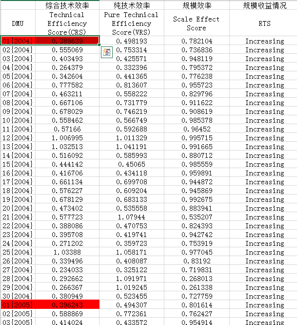那么,图2中,DMU(1)的,pe2004=0.498193, pe2005=0.494307; se2004=0.782104, se2005=0.801614。