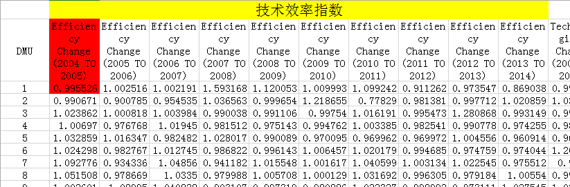 可图1中,DMU1的 effch(2004-2005)=0.995526