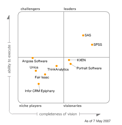 经过训练的模型会出现在这一栏中,这就像是真表(Truth Table)的概念那样,训练过的模型可以加入的数据流中用于预测和打分。另外,模型还可以导出为支持PMML协议的XML文件,但是PMML没有给定所有模型的规范,很多厂商都在PMML的基础上对模型内容进行了扩展,Clementine除了可以导出扩展的SPSS SmartScore,还可以导出标准的PMML 3.1。
