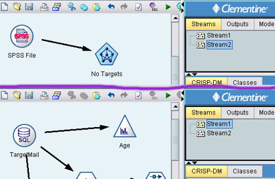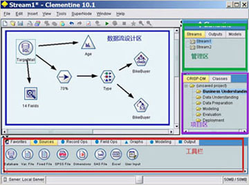 这个没什么好说的,看图就知道了,有向的箭头指明了数据的流向。Clementine项目中可以有多个数据流设计区,就像在PhotoShop中可以同时开启多个设计图一样。