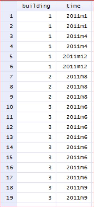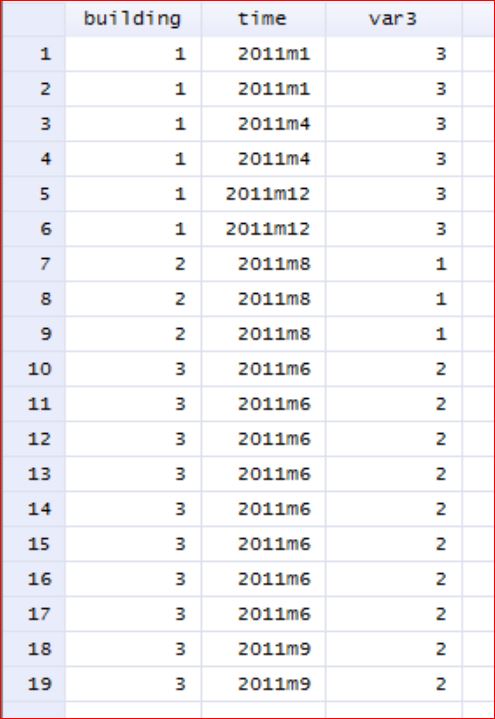 原始数据和效果图如下,有2个原始变量building和time,想创建变量var3表示每一个building取值所对应的time取值的种类数量。比如,编号为1的building对应的time取值有3种(2011m1、2011m4、2011m12),和building==1对应的var3取值为3;编号为2的building对应的time取值有1种(2011m8),和building==2对应的var3取值为1;编号为3的building对应的time取值有2种(2011m6、2011m9),和building==3对应的var3取值为2。