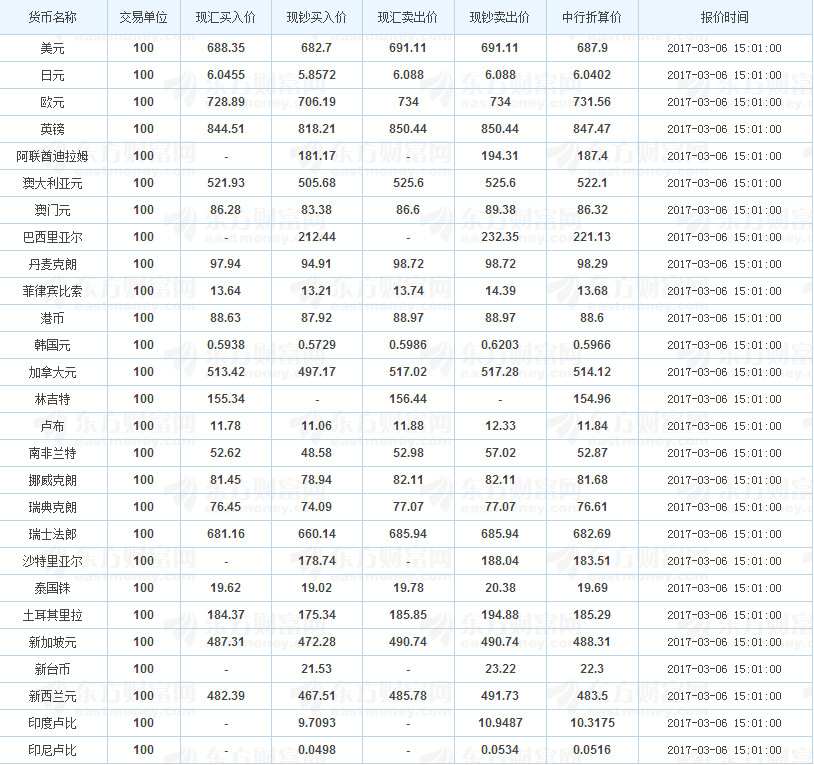 中国银行外汇牌价 2017-03-06(图片来源:东方财富网)