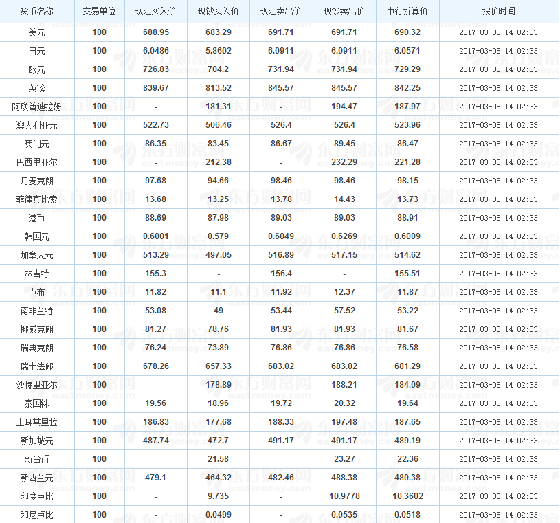 中国银行外汇牌价 2017-03-08(图片来源:东方财富网)