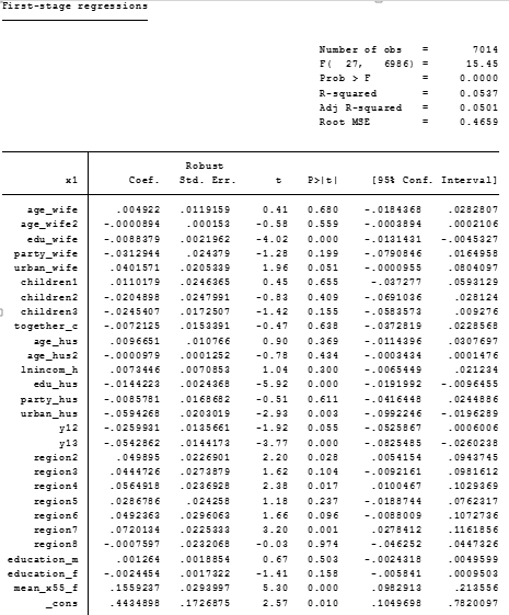 2.第一阶段和第二阶段的控制变量是否需要一致?因为看到一些文章(任胜钢等,2019),第一阶段的控制变量是“否”,第二阶段的控制变量是“是”,照理说用ivregress命令做出来的结果,两个阶段的控制变量都是一样的