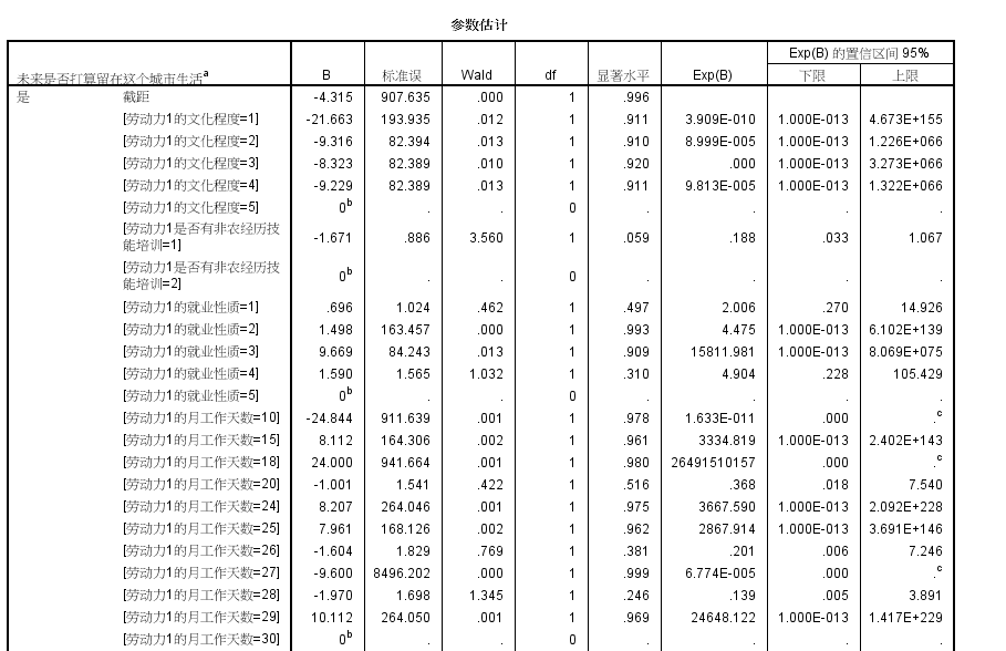 劳动力月工作天数这一变量建议以连续变量的形式纳入模型,而非以类别变量的形式纳入。同时,看你变量的对应的回归系数及相应的exp(B)值,极其不正常。多类别变量建议处理为虚拟变量,然后再纳入模型。此外,个人觉得你可能没有找准影响个人是否留在城市生活的关键因素,如收入能力、社会排斥等。祝好运~