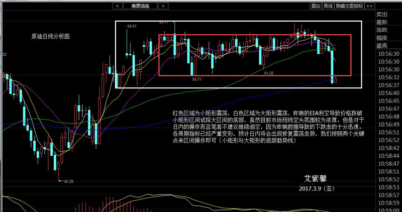 笔者在昨天给出的多单遗憾止损,EIA数据带来的短线影响远超过当前市场的利好基本面。油价在数据公布出来的瞬间直线下降,触及日线MA120均线支撑才稍有缓和。周二收取的光脚阴加上EIA的利空使目前油价上方压力巨大,但是需要注意的是我们目前价格已经接近日线周期大矩形波动的底部,要想纯靠EIA的利空是较难继续下破的,所以笔者艾紫馨认为日内的走势将会现有一波修复震荡。我们可以在大矩形底部与小矩形底部这个区间震荡操作,带好止损即可。