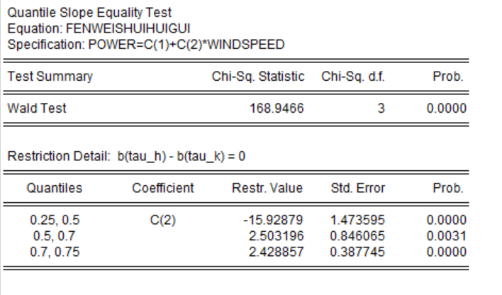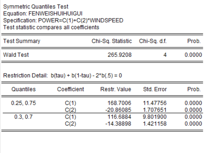 以下分别是分位数回归对称性检验和斜率相等检验的结果,求帮忙分析一下,谢谢!!