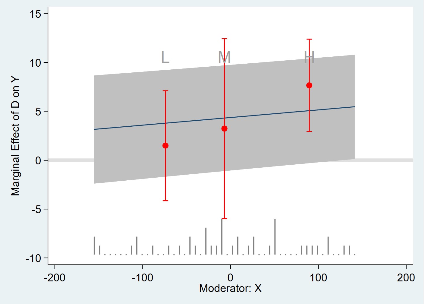 您有在讲义中提到,边际效果如果显著异于0是有意义的。我得到的结果用margins是显著异于0的,但是用interflex却只有在X接近400时才异于0.