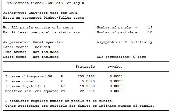 求大家指导。本人计量小白,刚学stata,在用面板数据进行ADF检验时,出现如下结果,请问下该如何汇报ADF统计量。还有就是,如果进行一阶差分,stata命令是怎么样的呢?那个滞后阶数又该如何选择?