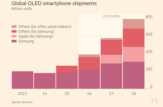 Samsung’s early adoption was aided by ready supply: its affiliate Samsung Display boasted a market share of 96 per cent in small and medium-sized OLED panels in the third quarter of 2016, according to IHS Markit.