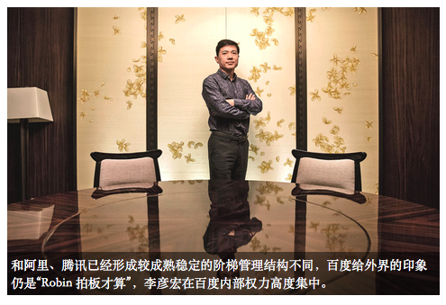 和阿里、腾讯已经形成较成熟稳定的阶梯管理结构不同,百度给外界的印象仍是“Robin 拍板才算”,李彦宏在百度内部权力高度集中。