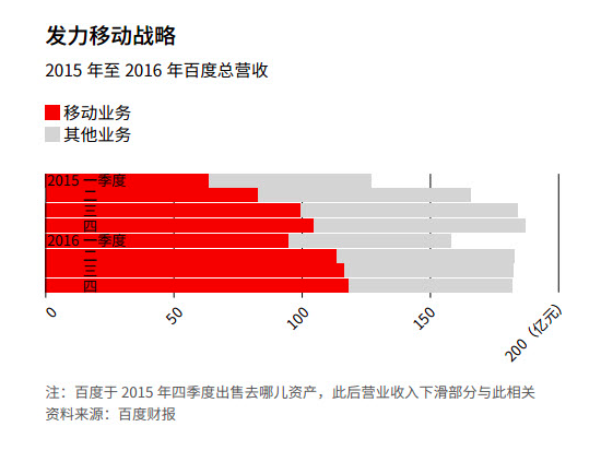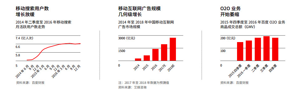 上述节目播出后一周,百度(NASDAQ:BIDU)公布了2016年财报,营业收入出现了历史性的下滑。2016年三季度和四季度,百度营收分别同比下降0.7%和2.6%。数字之下的更大危机是,移动搜索的用户基本见顶。2016年12月,百度移动搜索月活跃用户达到6.65亿,同比增长2%,而一年前的这个数字是21%。在2月24日的财报会议上,李彦宏坦承,百度几乎触及中国所有网民,增速放缓是必然。