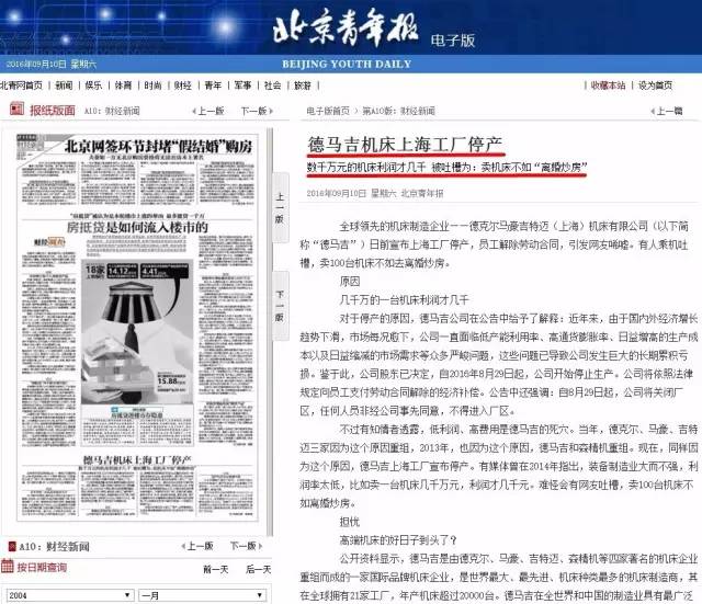 2016年9月10日的《北京青年报》刊发了一篇令我万分震惊的报道:全球领先的机床制造企业——德克尔马豪吉特迈(上海)机床有限公司(以下简称“德马吉”)日前宣布上海工厂停产,员工解除劳动合同,引发网友唏嘘。有人乘机吐槽,卖100台机床不如去离婚炒房。