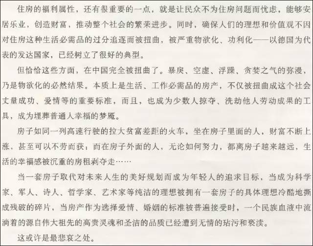 这个国家,最重要的不是房子,而是能推动民族前行的实体经济和无数为此奋斗的企业家和职工;在一个伟大民族前行的历史进程中,起决定作用的不是房子,而是民生,而是百姓疾苦,是民心,是民族凝聚力!当民生也如同房子一样被重视的时候,当民众活得有尊严活得精彩的时候,一个民族的伟大复兴之路,也才会更加光明更加精彩。我为中国祈祷!