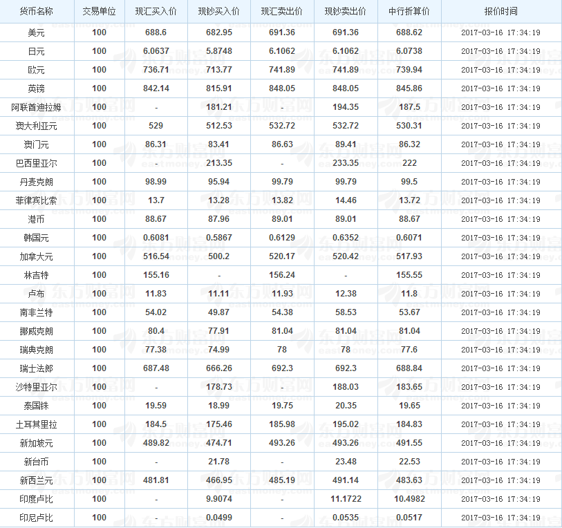 中国银行外汇牌价 2017-03-16(图片来源:东方财富网)