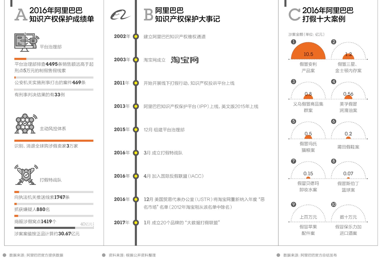 阿里巴巴为打击假货成立的内部组织—平台治理部,2016年排查到销售额远高于起刑点的制假售假线索总计4495条,其中公安机能够依据现行律法采取刑事打击的只有469个,目前通过公开信息确认已有刑事判决结果的仅33例,而且其中78.7%只判了缓刑。