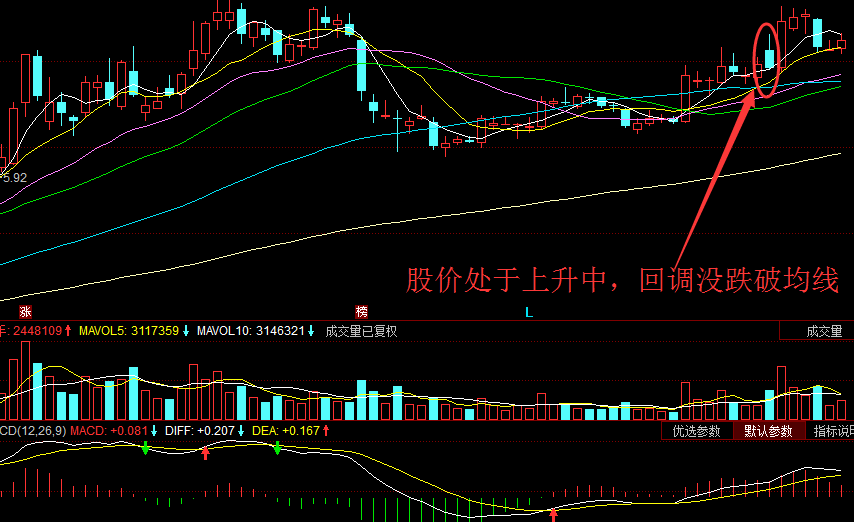 买点2、股价趋势走在均线之上,股价突然下跌,没跌破移动平均线,又再度上升,是买进讯号。 解读:均线所代表的是平均成本,那么股价跌到均线即止跌反涨,说明抛压是因为获利丰厚导致,一旦股价跌至均线,投资人利润减少,卖压就迅速降低,并很快又继续回升,表明市场气氛良好,股价很快会再创新高,因此为买入信号。 如果股价下跌至均线附近伴随着成交量的迅速萎缩,然后起稳并上涨,继续上涨的可靠性更高。