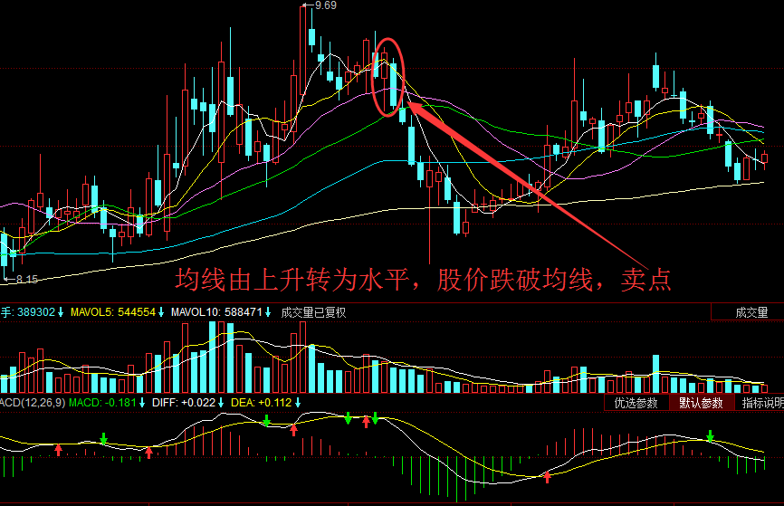 卖点1、均线从上升趋势逐渐转为水平,且有向下跌的倾向,当股价从平均线上方向下突破平均线时,为卖出信号。 解读:均线上升趋势逐渐转变为盘局,不是一朝一夕的事,大量筹码在这一价位换手,是大多数投资人的平均持仓成本区域。此时股价一旦下跌,导致所有在这一价位的买入者,全部被套牢。出于对亏损的恐惧,任何一次股价回升至这一价位区,都会因解套压力而迫使股价再次下跌,因此为卖出信号。