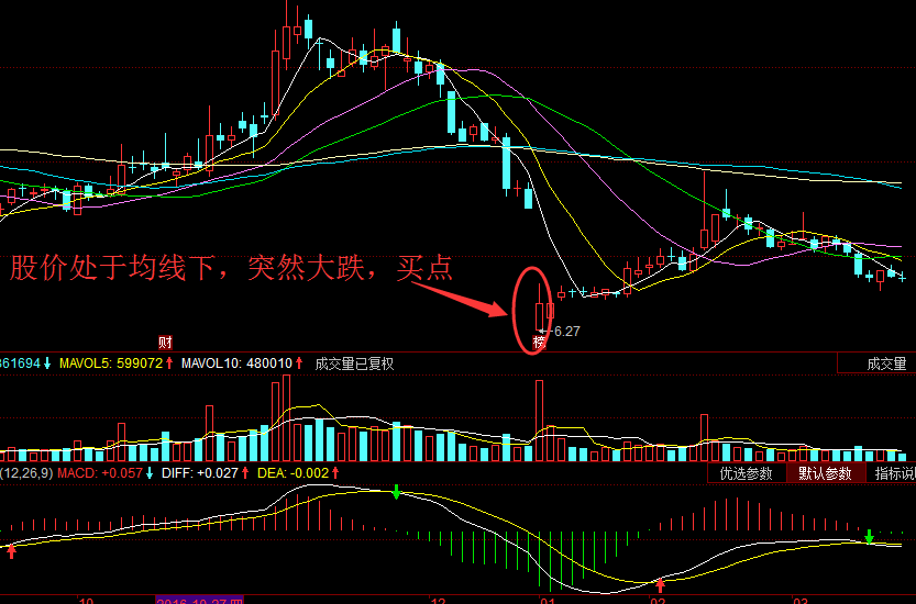 买点4、股价趋势走在平均线之下,突然出现暴跌,距离平均线非常远,极有可能随时再度靠近均线,亦为买进时机。 解读:股价的暴跌,会造成投资者突然亏损极为严重,严重的亏损会使投资者无法下决心割肉卖出手中持股,而产生强烈的观望情绪,致使很轻微的买气,很容易迅速将股价推高,因此为买入信号。