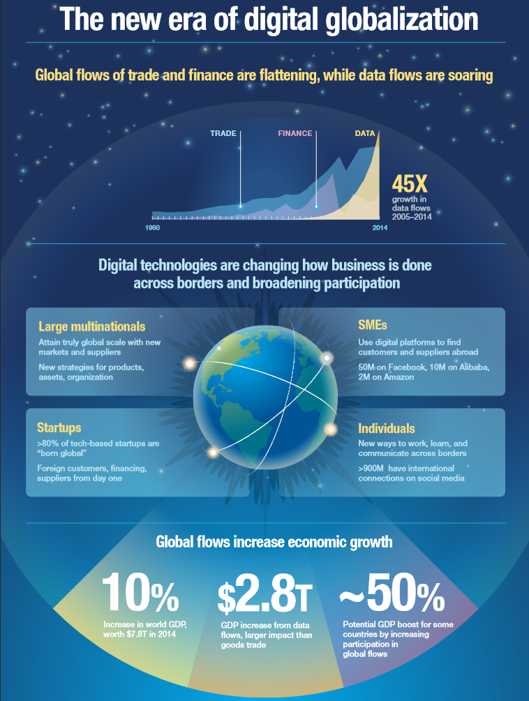 20世纪快速增长的国际贸易与金融流动自2008年以后就开始趋于平缓或下降。然而全球化趋势并未逆转。相反数字流正大幅增长——在世界范围内传递信息、思想和创新并且扩大对全球经济的参与。