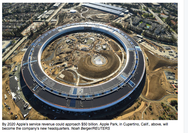 By 2020 Apple’s service revenue could approach $50 billion. Apple Park, in Cupertino, Calif., above, will become the company’s new headquarters. Noah Berger/REUTERS