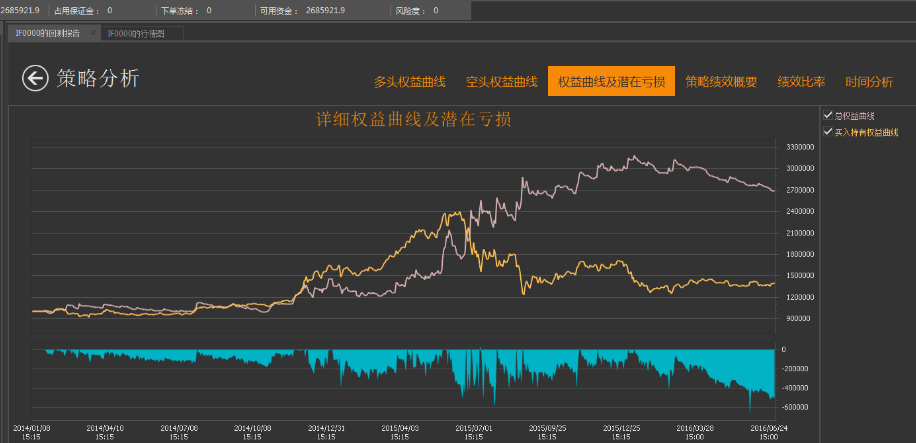 function Strategy1(default_unit,default_exitway,freq)%targetList = traderGetTargetList(); %获取目标资产信息HandleList = traderGetHandleList();%获取账户句柄global entry;for k=1:length(targetList); %--------------------仓位、K线、当前bar的提取-----------------------------% %获取当前仓位 [marketposition,~,~]=traderGetAccountPosition(HandleList(1),targetList(k).Market,targetList(k).Code); %策略中每次取数据的长度 dlags=11; lags=150; barnum=traderGetCurrentBar(targetList(k).Market,targetList(k).Code); %数据长度限制 if(barnum<lags) continue; end %获取K线数据 [time,open,high,low,close,volume,turnover,openinterest] = traderGetKData(targetList(k).Market,targetList(k).Code,'min',freq, 0-lags, 0,false,'FWard'); [Dtime,Dopen,Dhigh,Dlow,Dclose,Dvolume,Dturnover,Dopeninterest] = traderGetKData(targetList(k).Market,targetList(k).Code,'day',1,0-dlags, 0,false,'FWard'); if length(close)<lags || length(Dclose)<dlags continue; end % 虚拟交易所初始手数 totalunit=0; %-------------------------交易逻辑-------------------------------% %----------入场信号--------------------%% len=80;% p=0.3; ma0=ma(close,5); ma1=ma(close,20); std1=stdev(close,20); upline=ma1+std1; dnline=ma1-std1;% HC=max(Dclose(end-len:end-1));% LC=min(Dclose(end-len:end-1));% HH=max(Dhigh(end-len:end-1));% LL=min(Dlow(end-len:end-1));% range=max(HH-LC,HC-LL);% upline=Dopen(end)+range*p1;% dnline=Dopen(end)-range*p2;% HH=max(high(end-len+1:end));% LL=min(low(end-len+1:end));% con1=close(end)<LL+p*(HH-LL);% con2=close(end)>HH-p*(HH-LL);% con3=ma0(end)>ma1(end) && ma0(end-1)<ma1(end-1);% con4=ma0(end)<ma1(end) && ma0(end-1)>ma1(end-1);% s(1).buycon=con1 && con3;% s(1).sellshortcon=con2 && con4; len1=20; con1=ma0(end)>upline(end); con2=ma0(end)<dnline(end); con3=close(end)>max(close(end-len1+1:end-1)); con4=close(end)<min(close(end-len1+1:end-1)); s(1).buycon=con1 && con3; s(1).sellshortcon=con2 && con4; %----------主动出场信号----------------% s(1).sellcon=0; s(1).buytocovercon=0; %------------被动出场操作------------------% %找到未平仓的订单 remain=remainorder(entry,k); %对未平仓的订单进行平仓判断及操作 for i=1:length(remain.entrybar); % 进仓以来的bar个数 barsinceentry=barnum-remain.entrybar(i); backlen=10; % 回溯的长度(进仓bar之前) % 回溯的信息提取 [backtime,backopen,backhigh,backlow,backclose,~,~,~] = traderGetKData(targetList(k).Market,targetList(k).Code,'min',freq, 0-barsinceentry-backlen, 0,false,'FWard'); % 根据出场方式计算出场条件 if remain.entryexitway(i)==1; AFinitial=0; AFparam=0.02; AFmax=0.2; Firstbarmultp=1; %影响第一根bar的止损价,调高表示可忍受的回撤越多 [longstopcon,shortstopcon,exitline]=exit1(backopen,backhigh,backlow,backclose,remain.entrydirection(i),backlen,AFinitial,AFparam,AFmax,Firstbarmultp); elseif remain.entryexitway(i)==2; initialATRparam=2; AF=0.02; minATRparam=1; [longstopcon,shortstopcon,exitline]=exit2(backopen,backhigh,backlow,backclose,remain.entrydirection(i),backlen,initialATRparam,AF,minATRparam); elseif remain.entryexitway(i)==3; [longstopcon,shortstopcon,exitline]=exit3(backopen,backhigh,backlow,backclose,remain.entrydirection(i),backlen); elseif remain.entryexitway(i)==4 startpoint=10; percent=0.3; TRmutlp=1; [longstopcon,shortstopcon,exitline]=exit4(backopen,backhigh,backlow,backclose,remain.entrydirection(i),backlen,startpoint,percent,TRmutlp); elseif remain.entryexitway(i)==5; initialATRparam=1.4; AF=0.02; minATRparam=1; [longstopcon,shortstopcon,exitline]=exit2(backopen,backhigh,backlow,backclose,remain.entrydirection(i),backlen,initialATRparam,AF,minATRparam); end; % 出场执行 if longstopcon totalunit=totalunit-remain.entryunit(i); entry.record{k}(remain.num(i))=0; end; if shortstopcon totalunit=totalunit+remain.entryunit(i); entry.record{k}(remain.num(i))=0; end; end; %{ %------------------- 主动出场操作 --------------------% %再次找到未平仓的订单 remain=remainorder(entry,k); % 找到策略i的marketposition s=mptaking(s,remain); %----------------策略1----------------------% if s(1).sellcon && s(1).marketposition>0 totalunit=totalunit-abs(s(2).marketposition); % 把已经平掉的订单的开关关掉 for j=1:length(s(1).num) entry.record{k}(remain.num(s(1).num(j)))=0; end; end; if s(1).buytocovercon && s(1).marketposition<0 totalunit=totalunit+abs(s(2).marketposition); % 把已经平掉的订单的开关关掉 for j=1:length(s(1).num) entry.record{k}(remain.num(s(1).num(j)))=0; end; end; %----------------策略2----------------------% if s(2).sellcon && s(2).marketposition>0 totalunit=totalunit-s(2).marketposition; % 把已经平掉的订单的开关关掉 for j=1:length(s(2).num) entry.record{k}(remain.num(s(2).num(j)))=0; end; end; if s(2).buytocovercon && s(2).marketposition<0 totalunit=totalunit+s(2).marketposition; % 把已经平掉的订单的开关关掉 for j=1:length(s(2).num) entry.record{k}(remain.num(s(2).num(j)))=0; end; end; %} %---------------------------加仓--------------------------------% %----------------策略1----------------------% %再次找到未平仓的订单 remain=remainorder(entry,k); % 找到策略i的marketposition s=mptaking(s,remain); % 找到最近的加仓点和加仓价格 if s(1).marketposition~=0; lastentrybar=max(remain.entrybar(s(1).num)); lastbarsinceentry=barnum-lastentrybar; lastentryprice=open(end-lastbarsinceentry+1); vector=remain.entrydirection(s(1).num); lastdirection=vector(end); TRvalue=TR(close,high,low); ATR=ma(TRvalue,10); s(1).addbuycon=0; s(1).addsellshortcon=0; if lastdirection>0 s(1).addbuycon=close(end)-lastentryprice>2*ATR(end); elseif lastdirection<0 s(1).addsellshortcon=lastentryprice-close(end)>2*ATR(end); end; %---------------加仓操作-------------------------% if s(1).addbuycon && s(1).marketposition>=default_unit && s(1).marketposition<default_unit*2 addbuyunit=default_unit*0.5; totalunit=totalunit+addbuyunit; [~]=entryalter(k,barnum,1,1,addbuyunit,5,1)