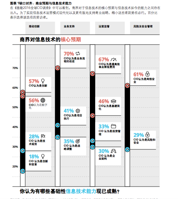 云技术、分析技术和数字化,这些强大的技术力量在商业世界掀起了一阵变革之风, 也改变了信息技术行业的运营方式和使命。 在过去十年里,各大公司CIO的运营方式可谓是五花八门。他们把信息技术行业的工作重点从系统维护 和系统支持转移到创新和实现商业战略上去。他们 重塑了旧系统,以便投放新技术和降低复杂性。他们中有一些甚至向风投家学习,把信息技术作为一 种“资产组合”进行管理。回过头来看,21世纪 初,CIO单纯作为“系统维护者”的概念现在就显得荒谬过时了。