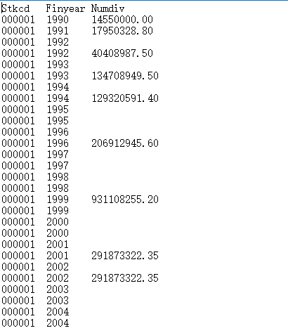 数据如图所示,同一股票代码的数据1992年之后每年都有两个,而且一个有numdiv的数据一个没有