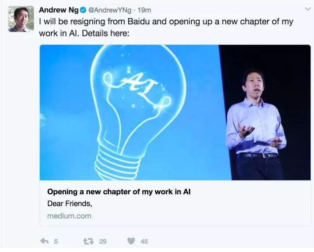 大家好,今天我宣布将离开百度,我曾在领导过公司的人工智能团队。百度的人工智能团队非常强大,拥有很多人才。我对于百度人工智能的未来非常有信心。在离开百度以后,我将继续致力于让人工智能改变社会,希望在不久的将来,人工智能技术可以为所有人带来福祉。