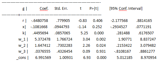 各大神,以上是小弟门槛模型回归结果的一部分,经检验属于双门槛模型,其中g为被解释变量,r、x、k为控制变量,w为主要解释变量,同时也是门槛变量,请问从显著性考虑,以上结果可用吗 望多多指教啊