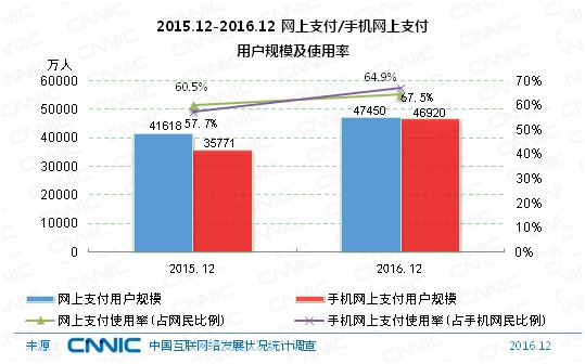 根据中国互联网数据咨询中心显示:截至2016年12月,我国使用网上支付的用户规模达到4.75亿,较2015年12月,网上支付用户增加5831万人,年增长率为14.0%,我国网民使用网上支付的比例从60.5%提升至64.9%。其中,手机支付用户规模增长迅速,达到4.69亿,年增长率为31.2%,网民手机网上支付的使用比例由57.7%提升至67.5%。