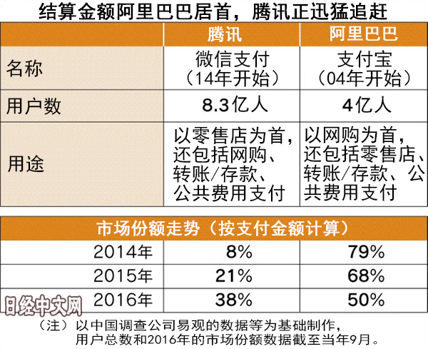 从交易规模方面来看,腾讯利用将近9亿人的微信用户,从2016年开始向手机支付业务全面出击。以“微信支付”为主力,截至2016年9月底已获得8.3亿支付用户,轻松超过了只有4亿用户的支付宝。