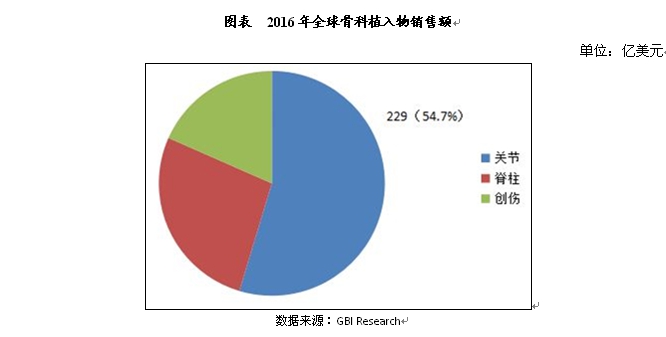 骨科植入物是骨肌系统治疗的方式之一,植入物的主要功能是全部或者部分替代人体关节、骨骼或肌肉骨骼系统。骨科植入市场中最常用到的三个产品类别为:关节植入物、脊柱植入物、创伤植入物,其2016年全球市场占比可参考下图。